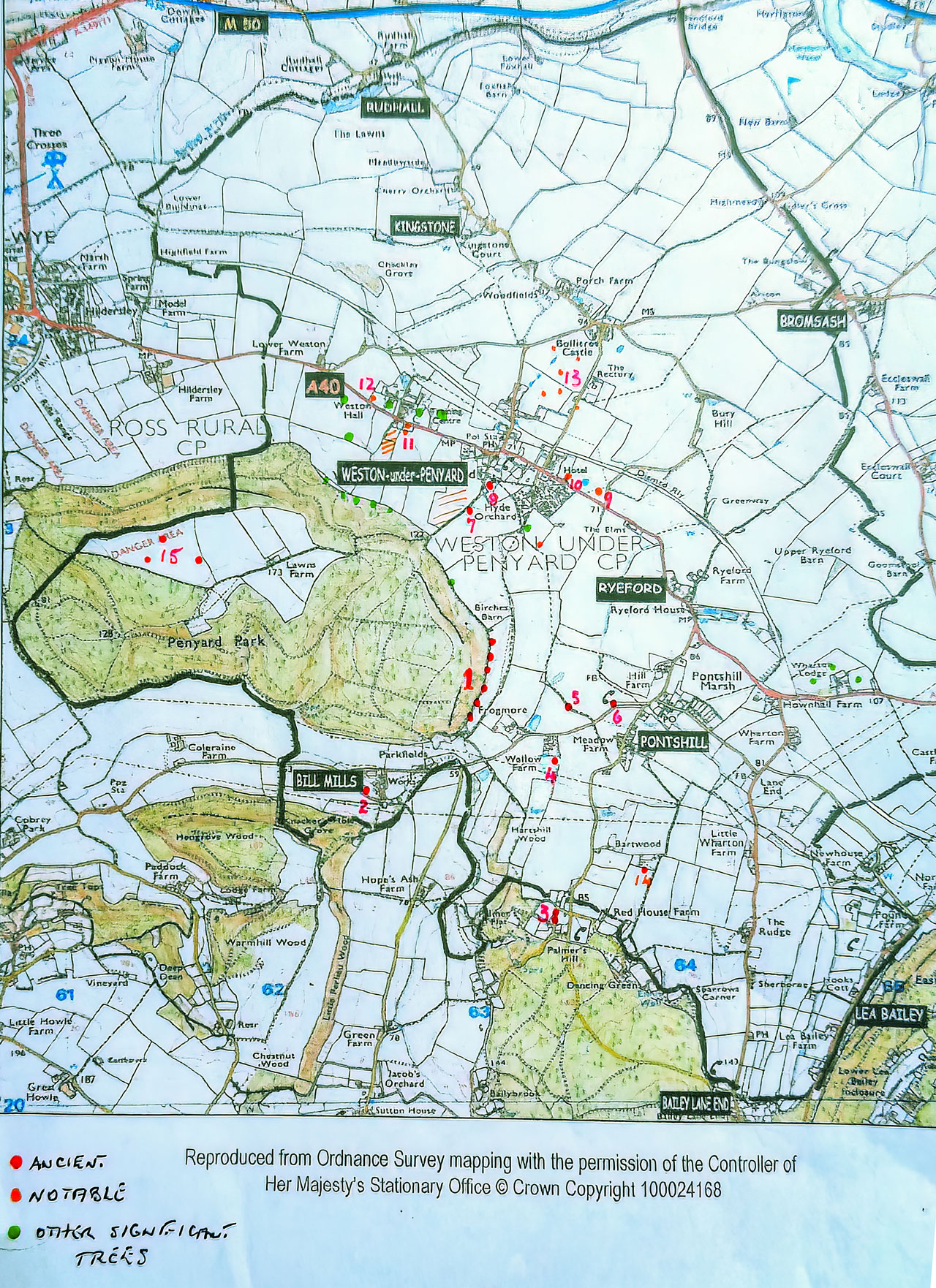 The map shows the location of the oldest and most significant trees, all of which in Paul’s opinion, should be given maximum protection from the above threats. These trees numbered on the map are listed below with observations and some recommendations.
